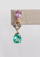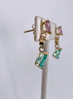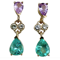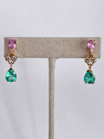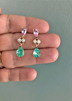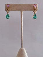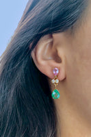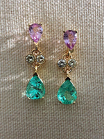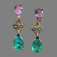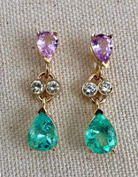 Two natural Colombian emeralds (3.0 carat total weight ), two natural pink sapphires (1.72 carat total weight). The gemstones are accented with 0.48 carat round brilliant cut diamonds. This pair of dangle earrings is perfect for any occasion!