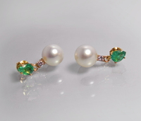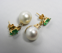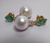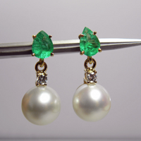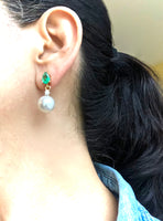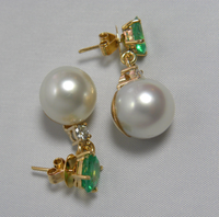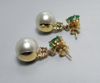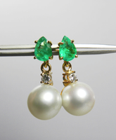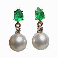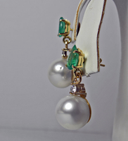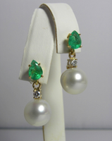 Natural Emerald Diamond & Pearl Dangle Earrings 18k Gold Gorgeous