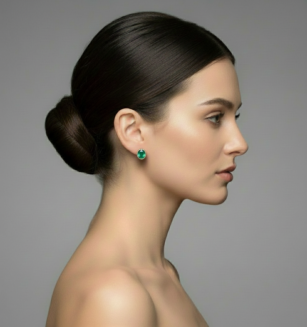 Timeless Stud Earrings Natural Medium Green Colombian Emerald BIG Oval Cut Total Weight Approx. 6.00 Carats Primary Stones: 100% Natural Colombian Emeralds Shape or Cut: Oval Cut Average Color/Clarity: Medium Green/ Clarity, VS Total Weight Emerald over 6.00 Carats (2 emeralds) Style: Studs/ Bezel Set Earrings Measurement: 10.10mm x 8.60mm Composition: Yellow Gold 18K. Comments: Push Backs