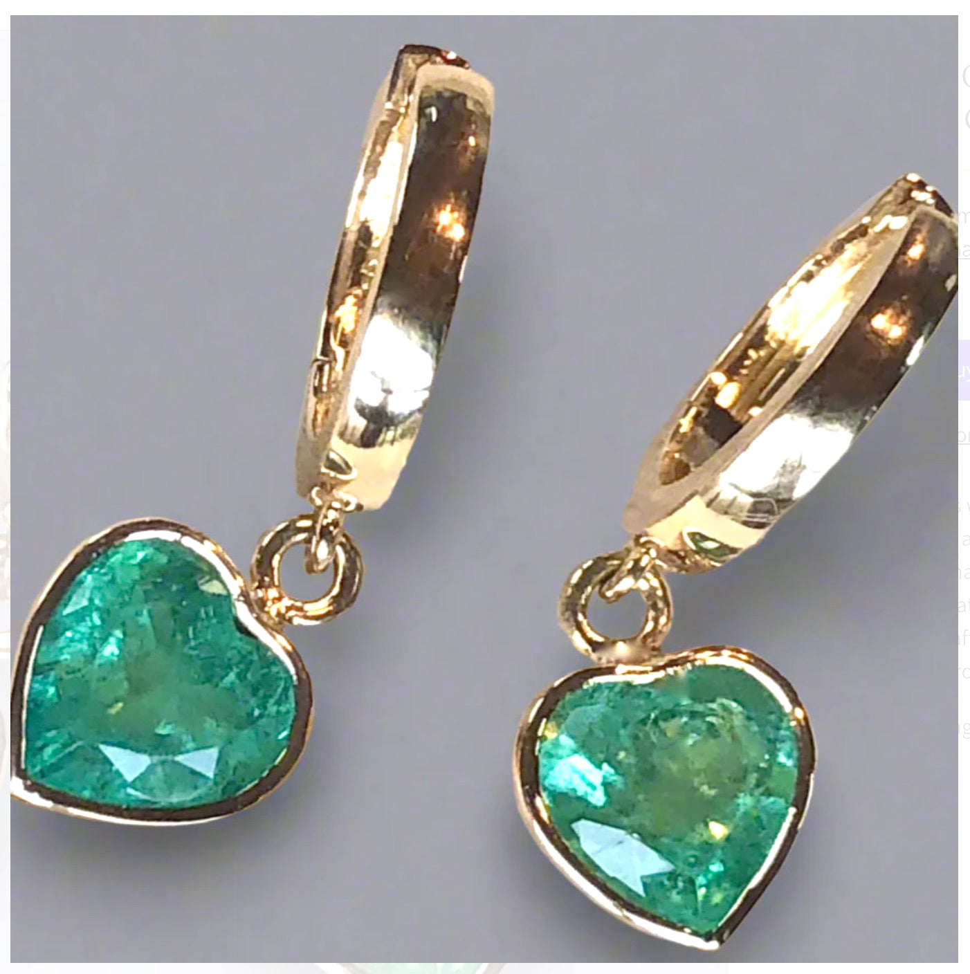 18k dangle earrings with 2 heart-shaped Colombian emeralds weighing approx. 4.80 carats The heart shapes- perfectly matched Colombian emeralds light-medium green, great clarity, and brilliance, are exquisitely handcrafted 18K yellow gold bezel mounting hanging perfectly from hoop earrings tops.