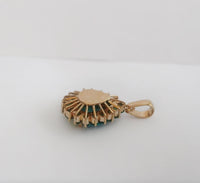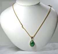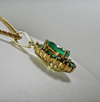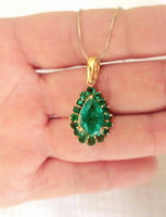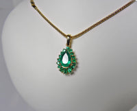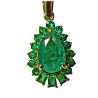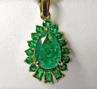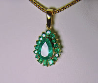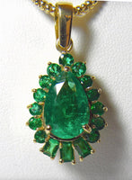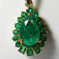 This is a 5.20 carats vibrant AAA green natural Colombian emerald pendant crafted in 18K yellow gold. The center emerald is a pear cut weighting over 4.0 carats and is surrounds by 1.20 carats of emeralds. The pendant measurements are 25.00mm x 15.40mm, rising 7.00mm. The average color/clarity is an intense fine green 100% NATURAL color/ clarity VS.