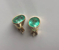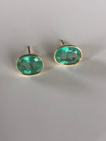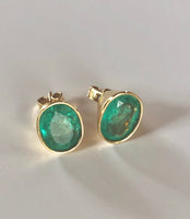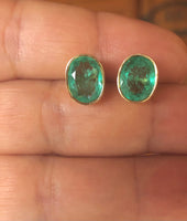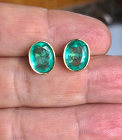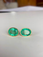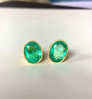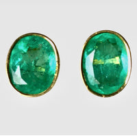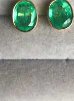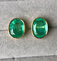 Timeless Stud Earrings Natural Medium Green Colombian Emerald BIG Oval Cut Total Weight Approx. 6.00 Carats Primary Stones: 100% Natural Colombian Emeralds Shape or Cut: Oval Cut Average Color/Clarity: Medium Green/ Clarity, VS Total Weight Emerald over 6.00 Carats (2 emeralds) Style: Studs/ Bezel Set Earrings Measurement: 10.10mm x 8.60mm Composition: Yellow Gold 18K. Comments: Push Backs