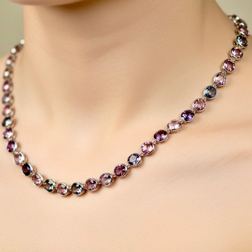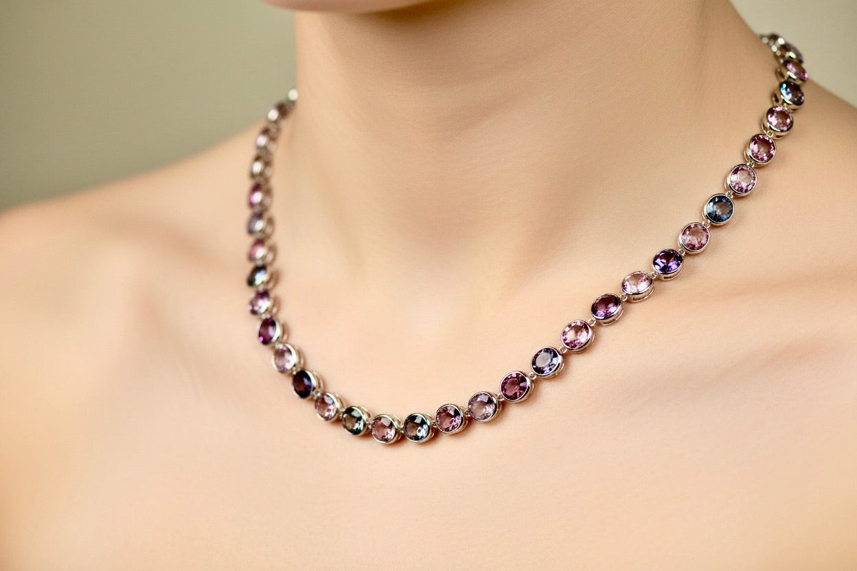 Discover the captivating allure of this exquisite Fine Natural Burmese Untreated Spinel Necklace, featuring 70 carats of premium Burmese spinels in a mesmerizing spectrum of colors—from delicate rose and peach tones to rich blues and lavenders. Expertly set in 18K gold and measuring 18 inches, this one-of-a-kind piece showcases nature's finest gemstones in their full glory. Each spinel has been individually selected for its exceptional color and quality, as shown in our detailed video and photography. Customize your necklace with your choice of gold finish—yellow, rose, or white—to perfectly complement your personal style. Handcrafted to order in 4-6 weeks, this investment piece reflects Emeralds Maravellous' commitment to superior craftsmanship and fair pricing. Contact our design team to discuss any modifications or special requests for your bespoke creation.