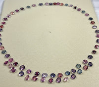 A celebration of fine natural spinel in a row! The necklace is a vivid multi-color of Burmese spinels in vibrant and stunning colors: from tender rose and peach to deep blue and lavender. The necklace is set in 18K gold. Length 18 in.