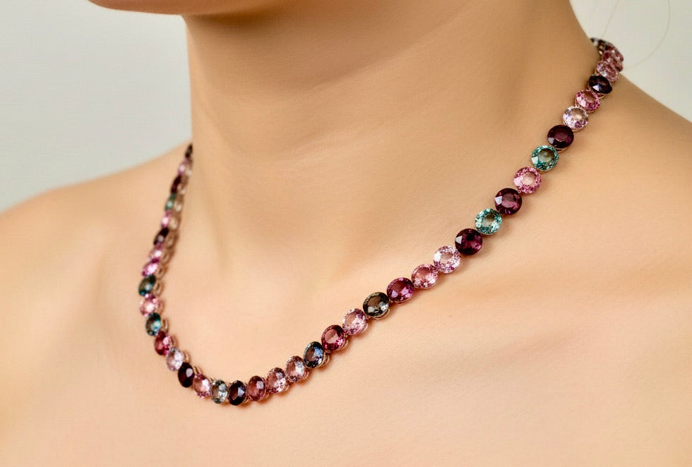 Discover the captivating allure of this exquisite Fine Natural Burmese Untreated Spinel Necklace, featuring Approx. 79.00 carats of premium Burmese spinels in a mesmerizing spectrum of colors—from delicate rose and peach tones to rich blues and lavenders. Old round cuts, expertly set in 18K gold and measuring 18 inches, this one-of-a-kind piece showcases nature's finest gemstones in their full glory. Each spinel has been individually selected for its exceptional color and quality, as shown in our detailed video and photography. Customize your necklace with your choice of gold finish—yellow, rose, or white—to perfectly complement your personal style. Handcrafted to order in 4-6 weeks, this investment piece reflects Emeralds Maravellous' commitment to superior craftsmanship and fair pricing. Contact our design team to discuss any modifications or special requests for your bespoke creation