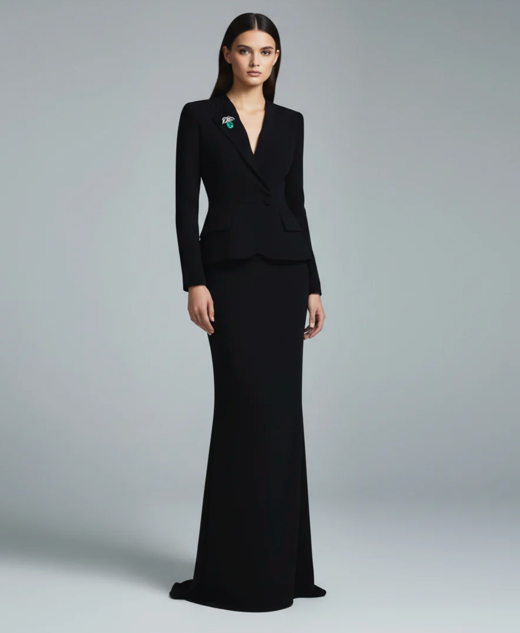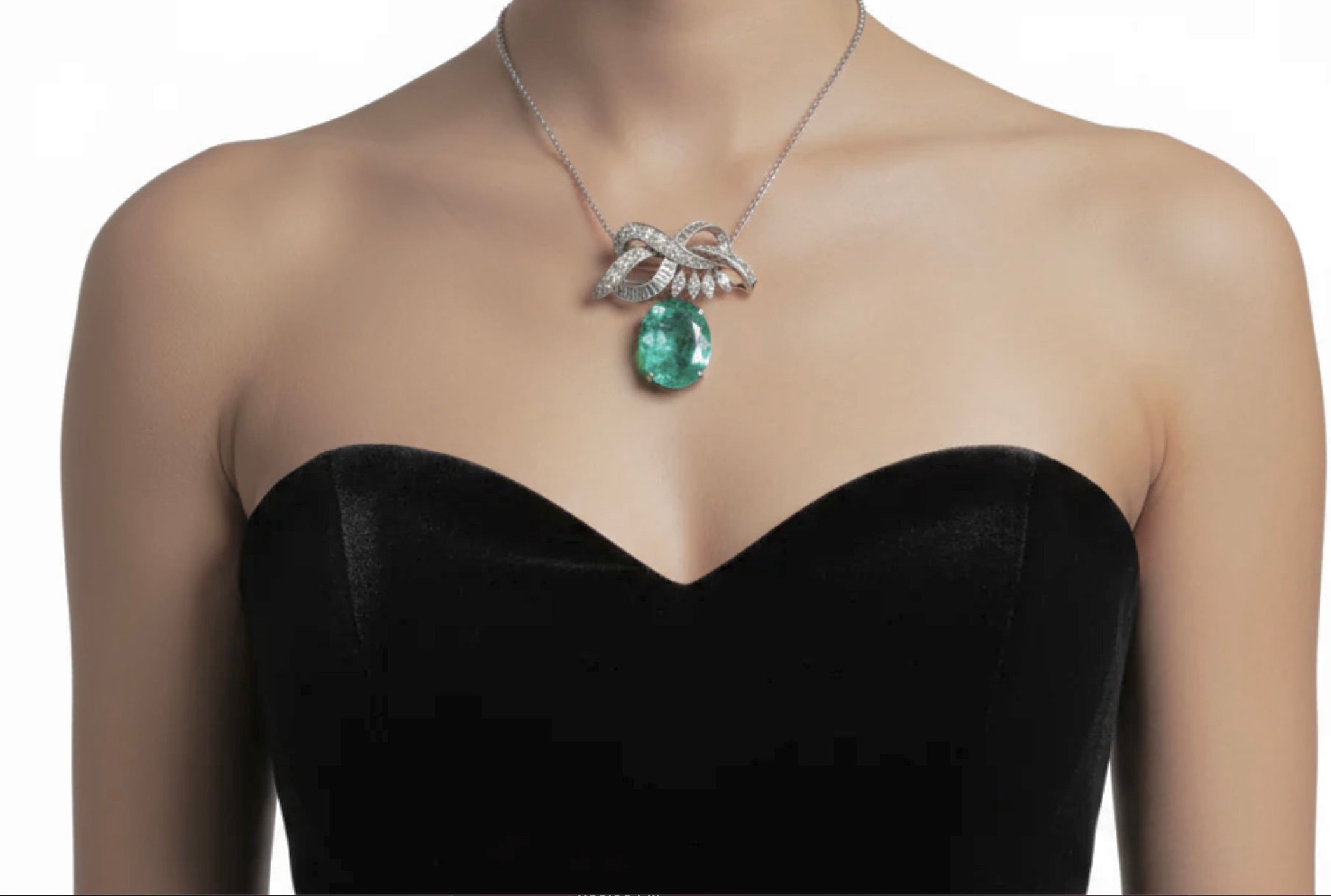 An exquisite brooch features an oval cut Colombian emerald weighing 16.16 carats set in a ribbon motif brooch. The ribbon is set with tapered baguette, step-cut diamonds, marquise cut diamonds and graduated brilliant-cut diamonds (Excellent VS1 clarity/Colorless F color) weighing 2.60 carats. The brooch is crafted in platinum.